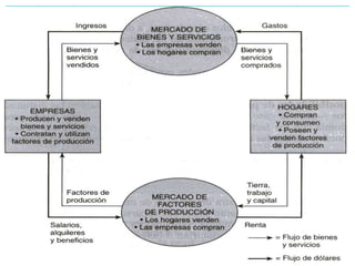 Este documento describe el flujo circular de la renta, que muestra cómo circula el dinero entre hogares, empresas y el sector público a través de la compra y venta de bienes y servicios. Las familias ofrecen trabajo a las empresas y compran sus productos, mientras que las empresas pagan salarios a las familias. El sector público recauda impuestos y usa los ingresos para comprar bienes y servicios.