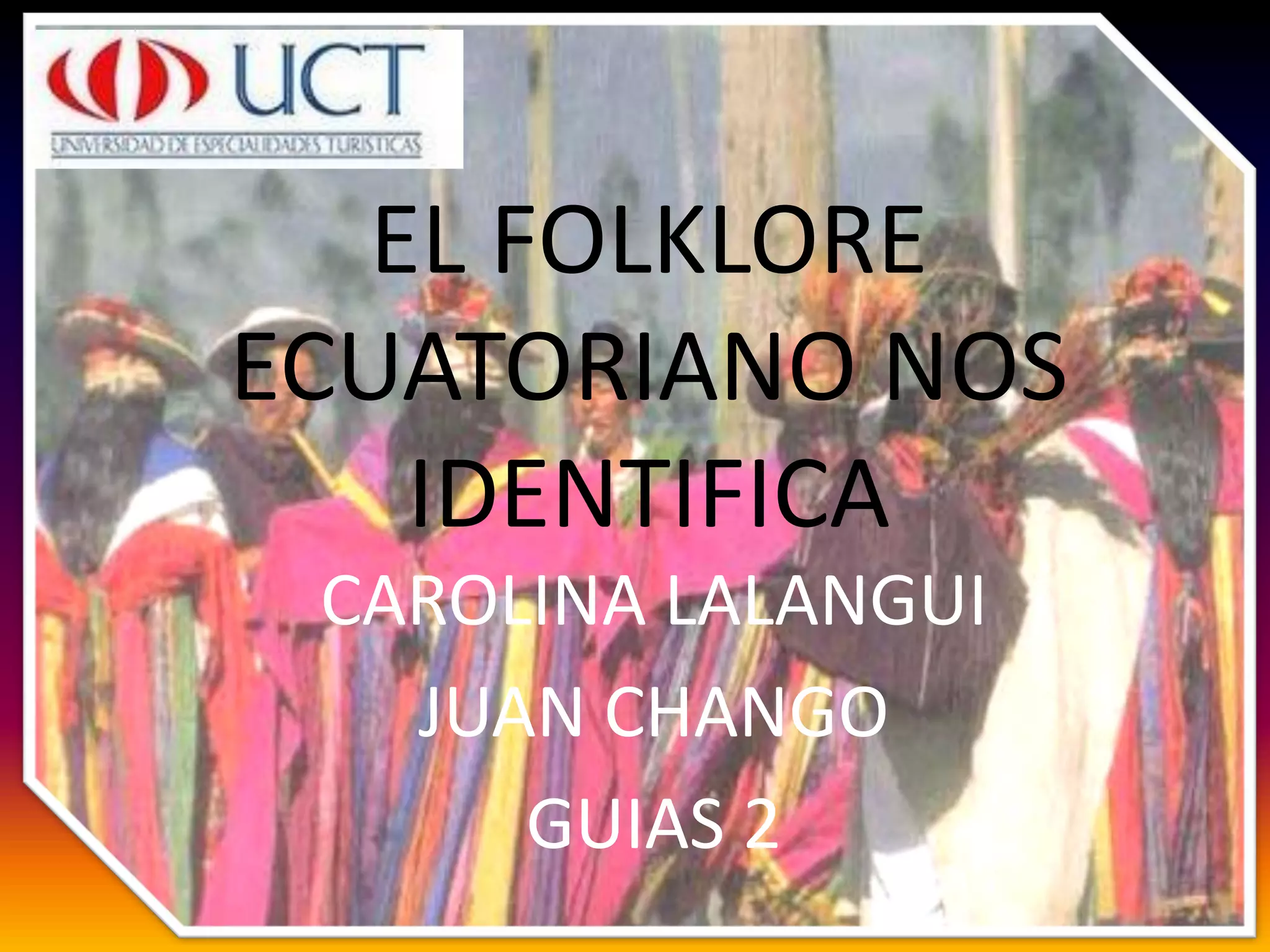 El folklore ecuatoriano incluye las costumbres y tradiciones que han sido transmitidas de generación en generación en los diversos pueblos del Ecuador, y que se manifiestan a través de eventos culturales que ocurren a lo largo del año, permitiendo que la comunidad y visitantes extranjeros observen las expresiones distintivas de cada región.