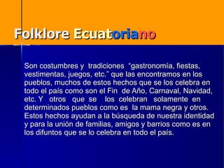El documento describe las tradiciones y costumbres del folclore ecuatoriano, incluyendo la gastronomía, fiestas, vestimentas y juegos que se encuentran en los pueblos de Ecuador. Celebraciones como el Fin de Año, Carnaval y Navidad se celebran en todo el país, mientras que otras como la Mama Negra solo se celebran en determinados pueblos. Las tradiciones como Los Difuntos y la colada morada ayudan a la unión de familias y amigos. Las fiestas folclóricas son muy conocidas y visitadas