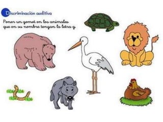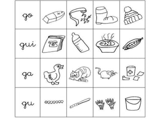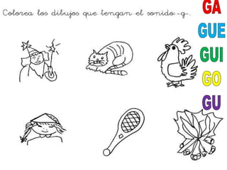 El documento aborda actividades para trabajar el fonema 'g' mediante ejercicios de respiración, movimientos de la lengua y sonidos de animales. Incluye ejercicios de discriminación auditiva con palabras como 'gato', 'gota', y onomatopeyas de diferentes animales. También menciona objetos relacionados con la letra 'g' como gafas, galletas, y gorros.