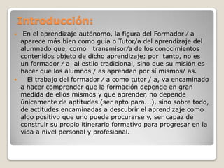 El documento describe las funciones de un formador en un entorno de aprendizaje autónomo. Actúa como guía para los estudiantes en lugar de transmisor de conocimiento. Sus funciones incluyen orientar a los estudiantes, prepararlos con herramientas, facilitar el aprendizaje, motivarlos, evaluarlos y promover la investigación.