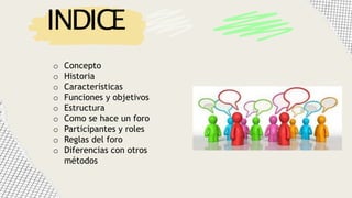 El documento describe las características y funciones de un foro. Explica que un foro permite la libre expresión de ideas sobre temas diversos. Describe la historia del foro en la antigua Roma y sus características como la discusión de temas de interés para los participantes. Resalta que un foro fomenta el intercambio de información, opiniones y conocimiento colectivo.