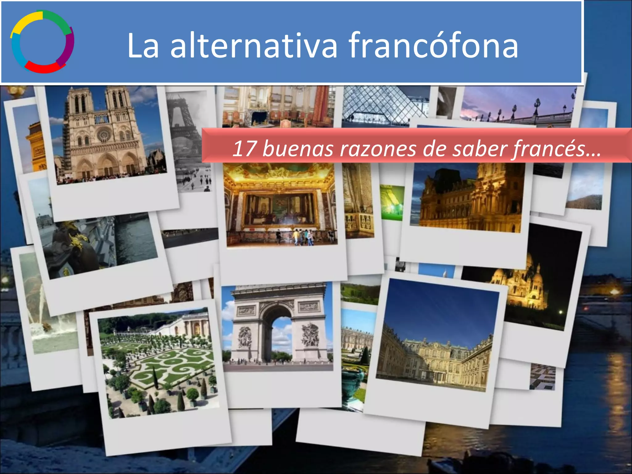 Este documento presenta 17 razones para aprender francés. Entre las razones destacadas se encuentran que el francés es una lengua hablada en los cinco continentes, que ofrece ventajas profesionales al trabajar para empresas multinacionales francesas, y que permite estudiar en prestigiosas universidades francesas. Además, el aprendizaje del francés brinda acceso a la rica cultura y literatura francesa y facilita las visitas a Francia y otros países francófonos.