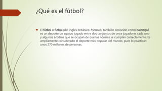 El fútbol es un deporte de equipo jugado entre dos conjuntos de once jugadores cada uno, con el objetivo de introducir un balón en la portería contraria siguiendo unas normas. Es el deporte más popular del mundo, practicado por unos 270 millones de personas.