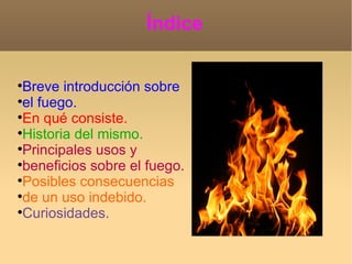 Este documento describe el fuego, su historia y usos. Explica que el fuego es una reacción química con desprendimiento de llamas, calor y gases. Los primeros humanos usaron el fuego para calentarse, cocinar y cazar. A lo largo de la historia se han desarrollado diferentes métodos para hacer fuego, como frotar piedras o usar mecheros y cerillas. El fuego tiene peligros como quemaduras e incendios forestales, pero también ha sido muy útil para la humanidad.