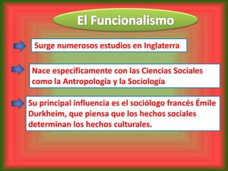 Este documento resume la teoría funcionalista en sociología. Surge en Inglaterra y se asocia con ciencias sociales como la antropología y la sociología. Sus principales exponentes son Émile Durkheim, quien pensaba que los hechos sociales determinan los culturales, y Talcott Parsons, quien analizaba la sociedad como una estructura con subsistemas que cumplen funciones indispensables. El funcionalismo se enfoca en explicar cómo las partes de una sociedad se interconectan y contribuyen a su funcionamiento total.