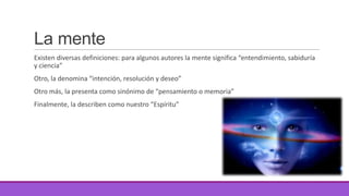 El documento presenta información sobre el funcionamiento de la mente. Define la mente como el software que coordina los elementos del cerebro o hardware. Explica que la mente juega un papel en filtrar la información que recibimos y solo dejar pasar lo que considera útil. Además, clasifica la memoria en tres tipos: a corto, largo plazo y también auditiva, visual y cinestésica.