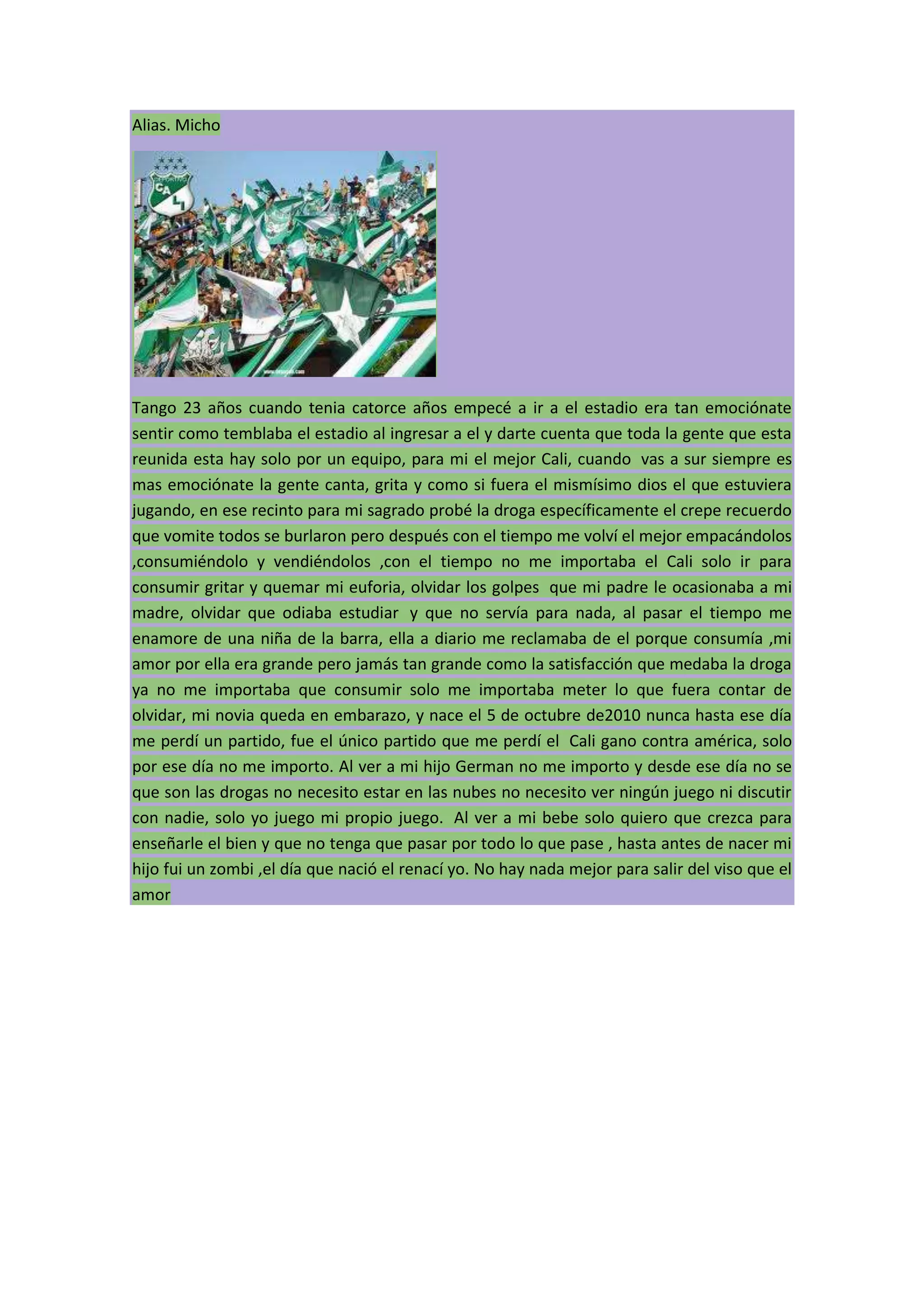 Alias tenía 23 años cuando empezó a ir al estadio a los 14 años y se enamoró del fútbol y del equipo Cali. Con el tiempo, comenzó a consumir drogas como el crep en el estadio para olvidar sus problemas personales. Luego se volvió traficante y consumidor habitual de drogas. Cuando su novia quedó embarazada y nació su hijo German el 5 de octubre de 2010, Alias dejó las drogas para siempre y ahora solo quiere enseñarle a su hijo el bien lejos de las adicciones.