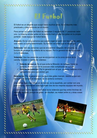 El futbol es el deporte más practicado y conocido en el mundo. Se juega entre dos equipos de 11 personas cada uno, con el objetivo de anotar goles en la portería rival. Cada equipo tiene un arquero, defensas, volantes de marca y creación, y delanteros, cada uno con funciones específicas para evitar goles o anotarlos.