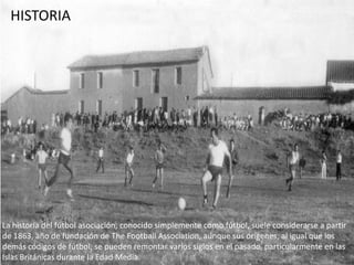 El documento habla sobre la historia y aspectos básicos del fútbol. Brevemente describe que la historia del fútbol moderno comenzó en 1863 con la fundación de la Asociación de Fútbol en Inglaterra, aunque sus orígenes se remontan a varios siglos atrás en las Islas Británicas. Explica que el fútbol es un deporte que involucra posiciones como portero, defensa, centrocampista y delanteros. Finalmente menciona algunos de los torneos más importantes como el Mund