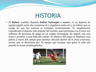 El documento proporciona una breve historia del fútbol y describe las principales posiciones tácticas en el juego, incluyendo guardameta, defensa, centrocampista y delantero. También menciona algunos de los clubes de fútbol más populares del mundo como el Barcelona, Real Madrid, Manchester United y clubes argentinos como Boca Juniors y River Plate.