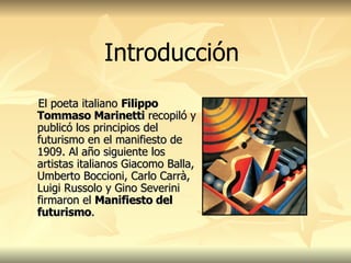 El movimiento futurista surgió en Italia en 1909 y buscaba romper con la tradición y captar la sensación de movimiento a través de técnicas como la superposición de acciones o fotografías tomadas a gran velocidad. Exaltaba lo sensual, lo nacional, la máquina y el movimiento. A través de manifiestos y obras buscaba renovar el arte e intervenir en la vida, proponiendo estéticas y formas de vestir innovadoras. Tuvo influencia más allá de lo artístico al crear una nueva