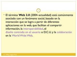 El documento habla sobre la Web 2.0 y sus características. Define la Web 2.0 como un fenómeno social basado en la interacción e intercambio de información entre usuarios a través de aplicaciones como redes sociales, blogs, wikis y servicios de alojamiento de videos. También menciona que permite a los usuarios interactuar y modificar contenido en contraste con sitios web pasivos donde solo se visualiza información.
