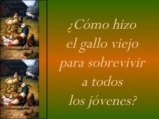 El gallo viejo desafía al gallo joven recién comprado a una carrera para demostrar quién está a cargo del gallinero. Aunque el gallo joven se burla de que ganará fácilmente, durante la carrera el granjero mata de un disparo al gallo joven al confundirlo con un gallo maricón. Esto demuestra que la experiencia del gallo viejo le permitió ganar la carrera y mantener el control del gallinero.