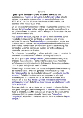 El gato doméstico ha estado en compañía del ser humano por unos 9500 años. Existen docenas de razas de gato doméstico en una amplia variedad de colores. Los gatos se comunican con vocalizaciones y lenguaje corporal, y aunque originalmente descendían del gato salvaje africano, evidencia genética ahora apunta a que descienden directamente de gatos salvajes del Medio Oriente.