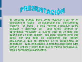 El trabajo presenta un cuento sobre un gato que aspira a ser un gran bailarín, enfrentándose a diversas situaciones que debe resolver. A través de esta historia, se busca desarrollar el pensamiento creativo de los estudiantes y fomentar su aprendizaje significativo. El cuento también incluye actividades evaluativas para reforzar la comprensión del texto.