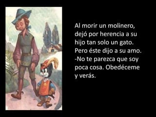 El Gato con Botas, heredado por el hijo de un molinero, usa su astucia para hacer que el hijo del molinero sea nombrado Marqués de Carabás y ganar el favor del Rey. El Gato engaña a un gigante transformándose en un ratón para que el Gato pueda comérselo, y luego le dice al Rey que el castillo pertenece al Marqués. El hijo del molinero y la princesa se casan, viviendo felices gracias a la astucia del Gato con Botas.