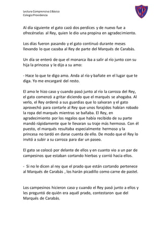 El gato del hijo más joven de un molinero fallecido usa su astucia para hacer que su amo parezca un noble rico y poderoso llamado el Marqués de Carabás. El gato lleva regalos de caza al Rey en nombre del Marqués y luego hace que parezca que varias tierras y un castillo pertenecen al Marqués. Gracias a las artimañas del gato, el Rey decide que el Marqués es un partido adecuado para casarse con su hija la princesa.