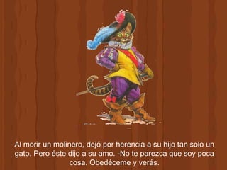 El hijo de un molinero heredó solo un gato después de la muerte de su padre. El gato usó su astucia para hacer que el hijo del molinero se hiciera pasar por el Marqués de Carabás, ganándose el favor del rey. El gato también engañó a un gigante transformándose en un león y luego en un ratón para que el gato lo comiera. Gracias a los trucos del gato, el hijo del molinero pudo casarse con la princesa y vivir felizmente en un castillo.