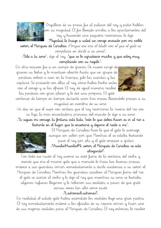El gato ayuda a su amo, un joven que heredó solo al gato, a convertirse en el Marqués de Carabás y ganar las tierras y el castillo de un ogro a través de su ingenio. El gato lleva regalos al rey en nombre de su amo, y organiza a la gente para que diga que las tierras por las que pasan pertenecen a su amo. Finalmente, el gato engaña al ogro para que se transforme en un ratón y luego lo come, dejando el castillo vacante para el rey y su hij