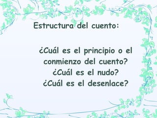 Este documento analiza el cuento "El gato con botas" dividiéndolo en su estructura, personajes y género literario. Explica que el comienzo presenta al protagonista gato y la sucesión de eventos que ocurren, el nudo describe las acciones del gato para engañar a otros y ganar recompensas para su amo, y el desenlace muestra cómo el gato logra una posición alta para su amo a través de sus trucos. Además, analiza que es un cuento de hadas con moraleja de que la