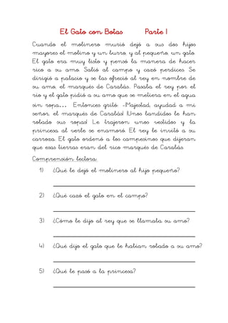Cuando el molinero murió, le dejó el molino y un burro a sus dos hijos mayores, y un gato a su hijo menor. El listo gato cazó perdices en el campo y se las ofreció al rey diciendo que eran de su amo, el marqués de Carabas. Luego el gato pidió a su amo que se metiera en el agua sin ropa para pedir ayuda al rey, y la princesa se enamoró de él.