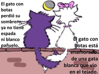 El gato con botas está enamorado de una gata blanca que vio en el tejado pero resulta que lo que vio fue un rayo de luna. Para tratar de encontrar a la gata, el gato le pide al rey que los case pero el rey necesita ver a la gata y un anillo para casarlos. Se ponen carteles ofreciendo pasteles a quien traiga a la gata blanca con ojos de lucero y dientecitos de perla pero nadie la puede encontrar porque lo que el gato vio fue solo un reflejo de la luna.