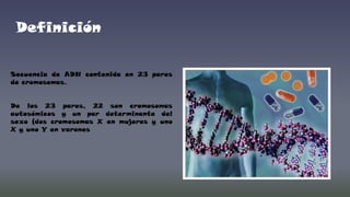 El documento describe las características del genoma humano. El genoma humano está compuesto por 23 pares de cromosomas que contienen la información genética para producir proteínas. Las proteínas, no el ADN, son las biomoléculas efectivas que llevan a cabo funciones estructurales y metabólicas. Las alteraciones en la secuencia de ADN pueden causar enfermedades genéticas como trastornos monogénicos y poligénicos.