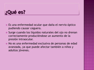 El glaucoma es una enfermedad ocular que causa daño al nervio óptico y puede provocar ceguera. Se produce cuando los líquidos dentro del ojo no drenan correctamente, aumentando la presión intraocular. Existen diferentes tipos de glaucoma como el de ángulo abierto que daña la visión de forma lenta e indolora, y el de ángulo cerrado que es muy doloroso. No tiene cura pero se puede tratar para frenar su avance mediante medicación, cirugía láser u otras intervenciones quirúrgicas.
