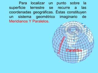 Las coordenadas geográficas, compuestas por meridianos y paralelos, son esenciales para localizar puntos en la superficie terrestre. La línea del ecuador es la base para la latitud, mientras que los meridianos definen la longitud. Existen dos representaciones del mundo: planisferios y globos terráqueos, siendo estos últimos más precisos aunque distorsionan las dimensiones en los polos.