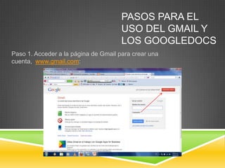 El documento proporciona 7 pasos para crear y usar una cuenta de Gmail y Google Docs, que incluyen registrarse en Gmail, completar los detalles de la cuenta, agregar una foto, acceder al correo electrónico, ingresar a Google Docs, crear un archivo en línea para compartir con otros, y hacer público el archivo para que otros puedan editarlo.