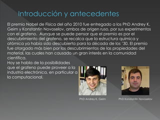 El documento describe el grafeno, un material bidimensional compuesto de átomos de carbono. Fue descubierto en 2004 por los científicos Andrey Geim y Konstantin Novoselov, quienes recibieron el Premio Nobel de Física en 2010 por sus investigaciones sobre las propiedades del grafeno. El material tiene propiedades notables como alta conductividad eléctrica y térmica, resistencia mecánica y ligereza.