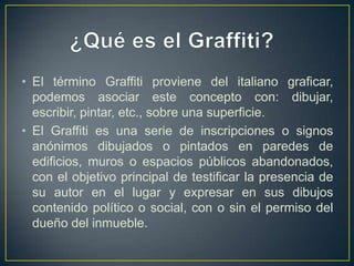 Este documento resume la historia y evolución del graffiti. Comienza explicando el origen del término y cómo surgió el graffiti moderno en las calles de Nueva York en los años 1960. Luego describe algunos exponentes clave de diferentes épocas como Cornbread, Caine 1 y Tracy 168. Finalmente, explica brevemente cómo el graffiti se popularizó en Chile entre las décadas de 1960 y 1980 y su relación actual con el movimiento hip hop.