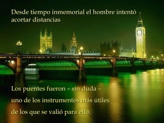 Este documento describe diferentes tipos de puentes a través de la historia y cómo han servido para acortar distancias. Menciona puentes que demuestran la fuerza de los ingenieros, otros que son esbeltos e interminables, y otros que parecen haber sido diseñados por espíritus. También hace referencia a un puente antiguo que aún perdura y es considerado el mejor puente jamás construido. Finalmente, compara a la Virgen María con un puente entre Dios y el hombre.