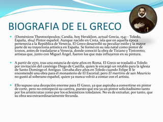 El Greco nació en 1541 en Creta pero desarrolló su estilo pictórico peculiar en España, donde se trasladó en 1570. Algunas de sus obras más importantes incluyen La Anunciación, La Trinidad, El Expolio y El entierro del conde Orgaz. El Greco se convirtió en un pintor muy solicitado en Toledo pero decepcionó a Felipe II con su obra El martirio de san Mauricio. Murió en 1614 en Toledo después de una prolífica carrera como pintor.