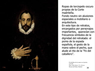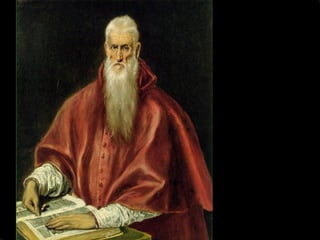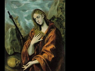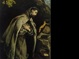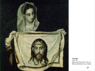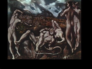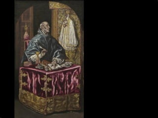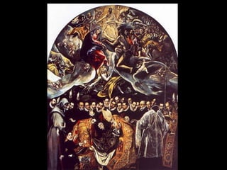 El documento resume la vida y obra del pintor español El Greco. Nació en Creta en 1541 y recibió formación en iconografía bizantina e influencias del Renacimiento italiano. Se trasladó a España en 1577 pero no tuvo éxito en la corte, instalándose en Toledo donde desarrolló su estilo manierista caracterizado por figuras alargadas, uso del color y la luz, y composiciones complejas sin perspectiva. Murió en Toledo en 1614 siendo uno de los grandes maestros de la pintura española.