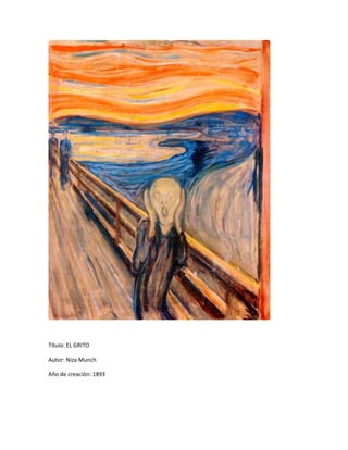 El cuadro El Grito de 1893 por el artista noruego Edvard Munch representa a una figura gritando en un paisaje con colores cálidos y luz semioscura. Munch buscó expresar su angustia sobre los cambios en la organización socioeconómica de su época y criticar la ciudad a través de esta obra, considerada una de las más importantes del expresionismo. El artista se inspiró en una experiencia donde sintió un "alarido infinito" que atravesaba la naturaleza mientras observaba un cielo rojo como sangre sobre