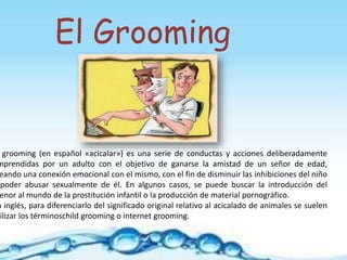 El grooming es un conjunto de conductas de un adulto que busca ganarse la confianza de un niño para abusar sexualmente de él. Las consecuencias para la víctima son graves, incluyendo daños psicológicos y físicos, así como problemas familiares. Se recomiendan medidas de prevención como el control del acceso a internet, educación sobre los riesgos en línea y la protección de datos personales.