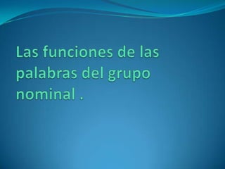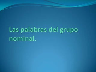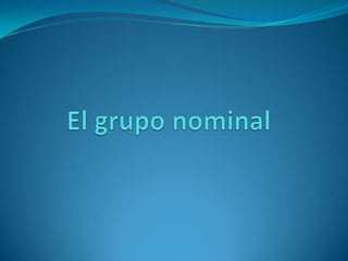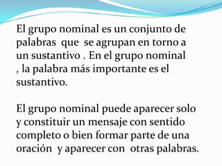 El grupo nominal se compone de una o más palabras que se agrupan en torno a un sustantivo. Las palabras clave en el grupo nominal son el sustantivo, que actúa como núcleo, el artículo, que funciona como determinante, y los adjetivos, que desempeñan el papel de complemento.