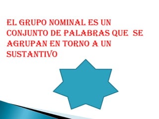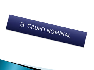 El grupo nominal se compone de un sustantivo alrededor del cual se agrupan otras palabras como el determinante y el complemento. Las funciones principales en el grupo nominal son el sustantivo como núcleo, el artículo como determinante y el adjetivo como complemento.