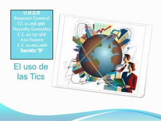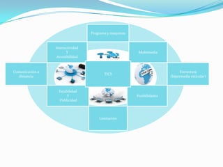 Este documento presenta las Tecnologías de la Información y la Comunicación (TIC) y su uso en la educación. Describe cómo las TIC permiten la comunicación a distancia, la interactividad y la accesibilidad. También explica cómo las TIC han evolucionado de Web 1.0 a Web 2.0 y 3.0, permitiendo que los usuarios sean cada vez más participantes activos y co-creadores de contenido en lugar de solo receptores. Finalmente, enumera varias herramientas web 2.0 como blogs, redes sociales y wikis que facilitan