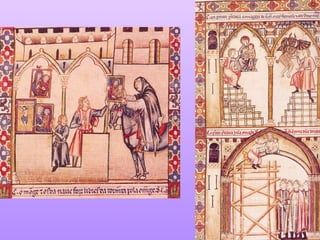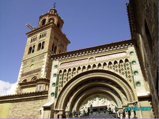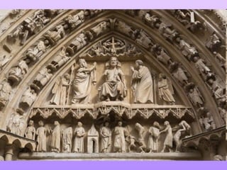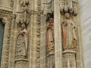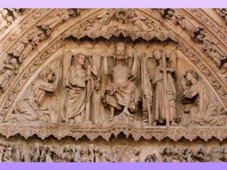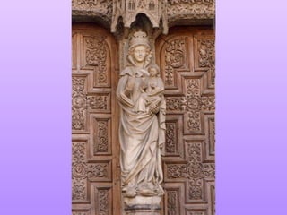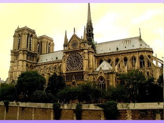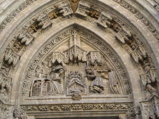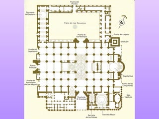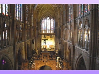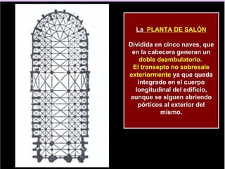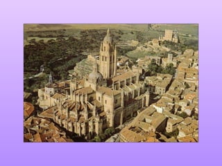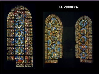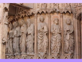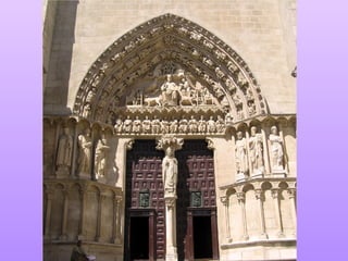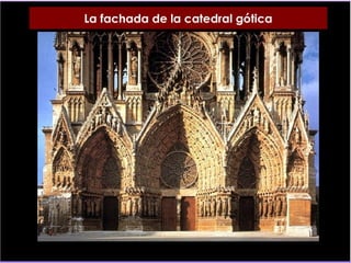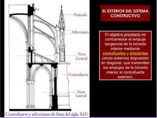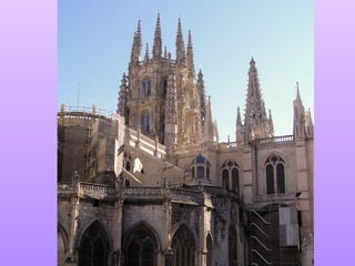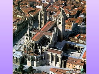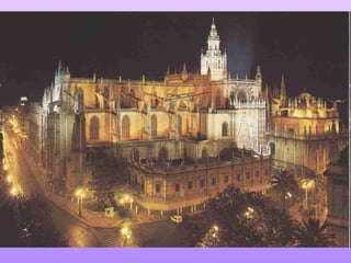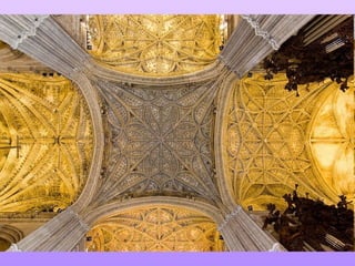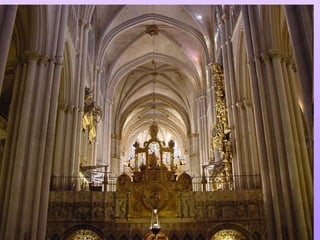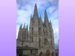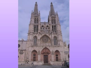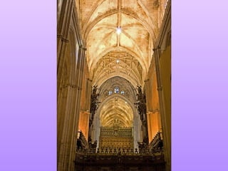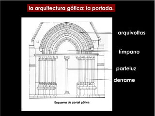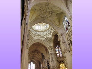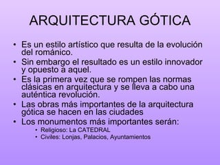 El documento describe la arquitectura gótica en España. El estilo gótico surgió como evolución del románico pero introdujo innovaciones que rompieron con las normas clásicas. Los monumentos góticos más importantes fueron las catedrales y edificios civiles como lonjas y palacios. Características clave del estilo gótico incluyen el arco apuntado y la bóveda de crucería. El documento también menciona varios ejemplos notables de arquitectura gótica como las catedrales de