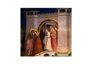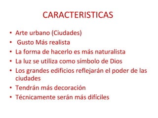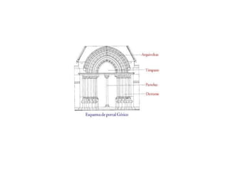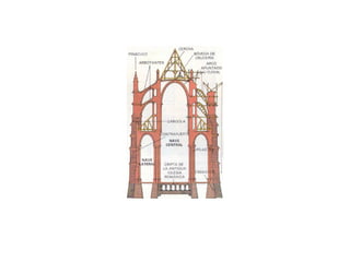 El documento describe las características del arte gótico entre los siglos XII y XV. Se destaca la arquitectura de las catedrales, con elementos como el arco ojival y la bóveda de crucería. La escultura gótica se caracteriza por estar policromada y unida a la arquitectura, con temas religiosos. La pintura gótica incluye retablos religiosos de tema exclusivo, con figuras planas y fondos de oro. Giotto marca la transición hacia el Renacimiento con un estilo más realista y