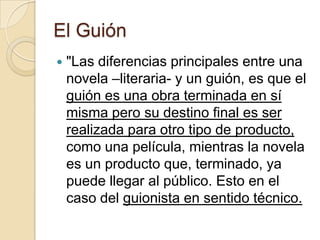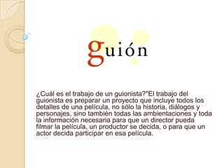 El trabajo de un guionista incluye preparar todos los detalles de una película en el guión, como la historia, diálogos, personajes y ambientaciones. Un guión para cine se escribe de manera diferente a uno para televisión debido a factores como las pausas comerciales y que la audiencia de televisión suele estar distraída. Generalmente, un guionista inicia el proceso con una idea original como un personaje o evento histórico, luego investiga sobre el tema y reescribe el guión múltiples veces para explor