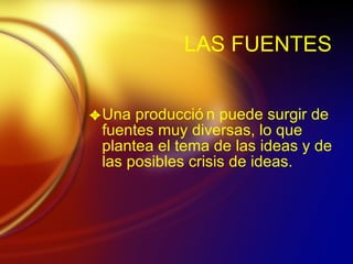 El documento resume las principales fuentes de las que pueden surgir ideas para guiones, incluyendo historias reales, obras literarias y la imaginación del guionista. Explica que los guiones pueden ser originales o adaptados de otras obras. Además, describe la estructura básica de un relato con un planteamiento, nudo y desenlace, y los diferentes elementos que componen un guión como la idea, el tema, la trama, los personajes y los diálogos.