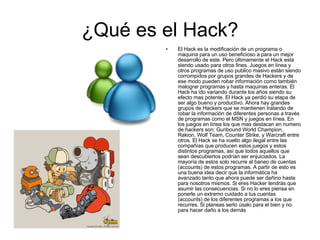 El documento describe cómo el hackeo ha cambiado de ser una modificación beneficiosa de programas y máquinas a ser una actividad ilegal realizada por grandes grupos de hackers para robar información personal y corromper programas y juegos en línea. Ahora, las compañías consideran el hackeo como ilegal y pueden enjuiciar a los hackers descubiertos, aunque generalmente solo los banean de sus cuentas. El documento concluye aconsejando ser cuidadoso con la información personal en línea y usar el hackeo solo para fines positivos en lugar