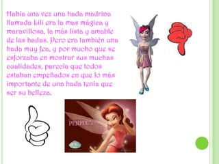 Lili era una hada fea pero muy mágica y amable. En la escuela de hadas y en sus misiones, siempre la criticaban y rechazaban por su apariencia. Un día, Lili rescató a sus compañeras hadas de un peligro usando su gran magia. A partir de entonces, las otras hadas apreciaron sus cualidades internas y su valía, más que su apariencia externa. Lili dejó de sufrir el rechazo y se convirtió en la mejor hada maestra.
