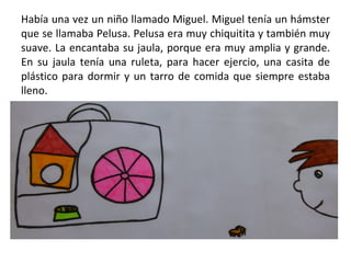 Pelusa el hámster era mascota de Miguel y le encantaba escaparse de su jaula por las noches para explorar la cocina. Una noche decidió entrar en el lavavajillas y se metió en problemas, pero tuvo la astucia de llevar una mochila con comida. Miguel había perdido la esperanza de encontrar a Pelusa, pero finalmente la descubrió en la cocina. A partir de entonces, Pelusa decidió dejar de escaparse y contentarse con jugar en su jaula.