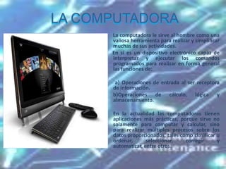 La computadora es una herramienta esencial que ejecuta diversos procesos a través de sus componentes clave como la tarjeta madre, microprocesador y disco duro, permitiendo operaciones de entrada, cálculo y almacenamiento. Los periféricos, como monitores, teclados y ratones, facilitan la interacción del usuario, mientras que impresoras y escáneres permiten la obtención de información impresa y digitalizada. La calidad y funcionalidad de estos componentes y dispositivos determinan el rendimiento y la eficacia operativa de un sistema informático.