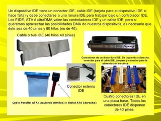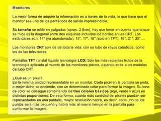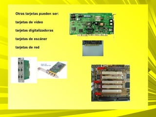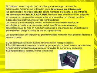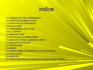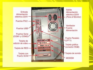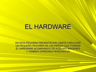 Este documento proporciona una introducción a las principales partes de hardware que componen un ordenador. Explica los componentes clave como la fuente de alimentación, la placa base, la tarjeta gráfica, el microprocesador, la memoria RAM, el disco duro y el monitor. También describe otros elementos importantes como las tarjetas de expansión y de red, el chipset, la BIOS y los buses de la placa base.